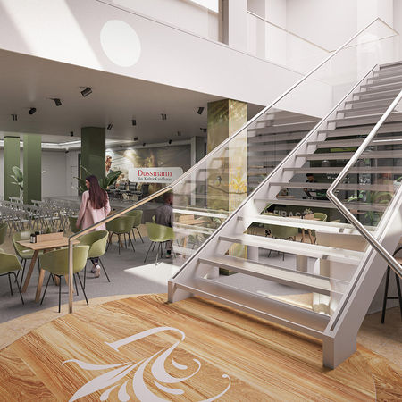 Das Ergebnis: Eine detailreiche Interior-Entwurfsvisualisierung, die den Charakter des Cafés im Dussmann KulturKaufhaus Berlin realitätsnah und überzeugend abbildet.